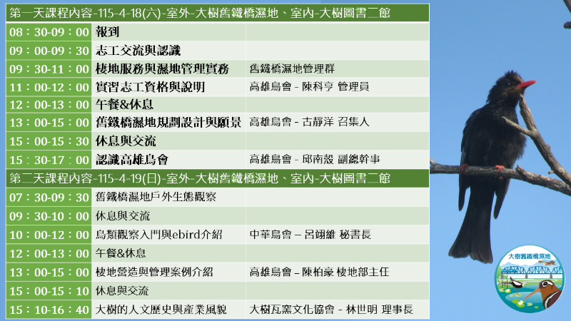 - 預定活動前三日以E-mail電子信箱寄發課程通知。若無E-mail者,請加入高雄鳥會LINE官方帳號,並完成傳送「報名參加大樹舊鐵橋濕地生態志工培訓,我是(姓名)…」訊息。LINE ID搜尋: @rxg4045a