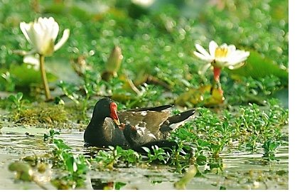 出現月份:1~12 常見地點:沈沙池、小池、大池 紅冠水雞,長33公分,嘴紅色先端黃,額板紅色,腳黃綠色,全身黑色,背、翼黑褐色,體側有一列白色斑點,尾下覆羽兩側有橢圓形白斑。通常小群出現於池塘、水田及溪畔的草叢地帶。善泳,浮游於水面時,常翹動尾羽,甚少飛行,多半在水面踩跑一段後,短距離貼水面飛行即落下,鳴聲為由高而低的連續顫抖喉音。