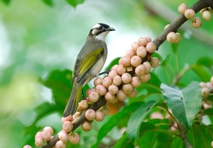 出現月份:1~12 常見地點:園區全區 鵯科,長18公分,頭、後頸黑色,後頭有白色斑塊,背面黃綠色略帶灰色,翼、尾羽黃綠色,耳羽有一白斑,喉白色,腹面污白色。出現於平地至中海拔之樹林,分布侷限於西半部楓港以北至宜蘭地區,是都市平地最常見的鳥種,聲音嘹亮變化多,常發出似「巧克力、巧克力」之鳴聲。
