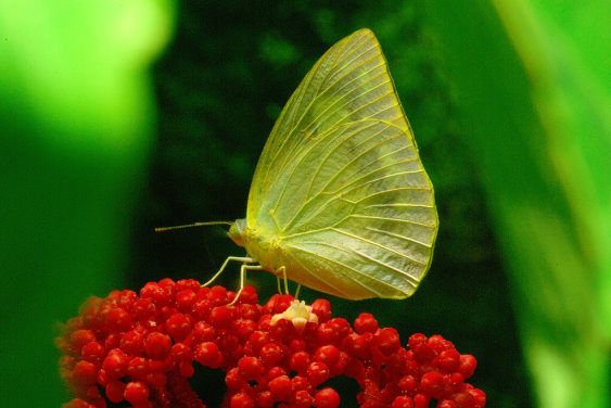 The Catopsilia pomona (lemon emigrant) is widely distributed all over Taiwan, especially street trees of leguminosae plants in in central, southern, or eastern Taiwan. They always attract thousands of lemon emigrants, offering a gorgeous sight. Living in low altitude mountain areas, the lemon emigrant is often seen to visit flowers and gather nectar. This species has two types: stripeless type and silver-stripe type. The latter has two adjoining small red round spots at the ventral center of hind wings and clear wing veins. The male has darker shades, while the female lighter. This type has light green and yellow individuals, with some having extra large stripes. The fodder of its larvae are plants like Kassod trees, golden shower trees, coffee sennas, and sickle sennas.