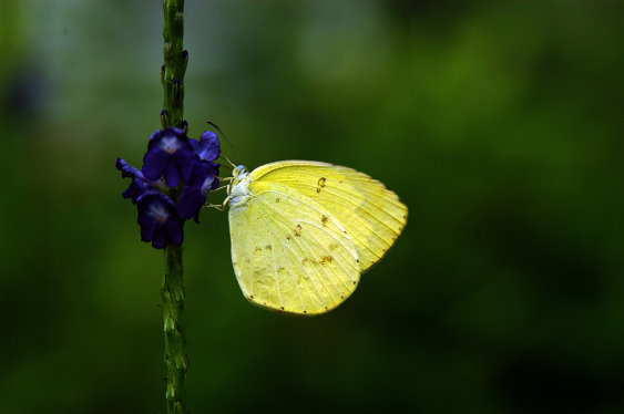 Living in ground level to low to intermediate altitude mountain areas, the Eurema blanda arsakia (three-spot grass yellow) likes to visit flowers. The slow flyer is the common species. It body size is larger than that of the Eurema andersoni godana and also bigger in number. The male three-spot grass yellow has yellow wing surfaces, black stripes on the outer edges of the fore wings, and dark brown stripes on front and back pronesurfaces. The female butterfly has wider dark zones on wing surfaces, lighter color, and wider physique. There are three types of its ventral sides of the wings: stripeless type,variegated type, and blackening type. The fodder of its larvae is leguminosae trees like Chinese apes-earrings, glossy-shower sennas, and Kassod trees.