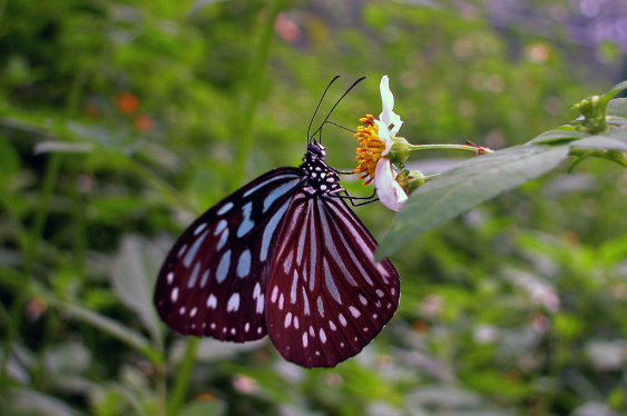 The adult Ideopsis similis (Ceylon blue glassy tiger) lives in places of ground level and low to intermediate mountain areas. It has dark brown wings with light green stripe spots, and its main feature is that on the fore wing fronts near the bases is a fine band of green stripe breaking into two parts, with the upper part slender and the lower part stubby. No conspicuous difference exits between the two sexes. It is habitual for the Ceylon blue glassy tiger to collectively migrate to the south for winter. It likes visiting flowers and gathering nectar. The fodder of its larvae is ovate-leaf tylophoras.