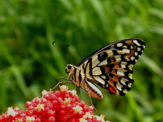 The commonest seen butterfly species in plains to low altitude mountain areas and even spoted in parks and schools in big cities, the two sexes of Papilio demoleus libanius (lime butterfly) are almost the same in physical stature. Black bases of the female’s wings are variegated with yellow scales with the yellow spots having light shade. The fodder of its larvae is plants like citrus fruits of Rutaceae family.