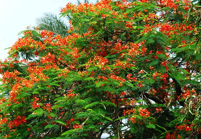 A megaphanecophyte native to Madagasikara, the Delonix regia (Boj.) Raf (flame tree) is well adapted to all-year-round warm climate in Taiwan and is widely planted. Its brightly red flowers are really an eye catcher. When they fully bloom in June and July, the tree tops are so red, seeming to be on fire. It has bipinnate compound leaves and flat pods about 50 centimeters in length. When the dry pods are shaked, its seeds inside will give off rattling sounds, serving as crude and simple musical instruments. When not flowering, it looks rather like falcate-leaved albizia, except that the latter has no pinnate leaves. There is a small community of flame trees at the right-side entrance of Niaosong Wetland Park mixed with several falcate-leaved albizia. Can you tell them apart?