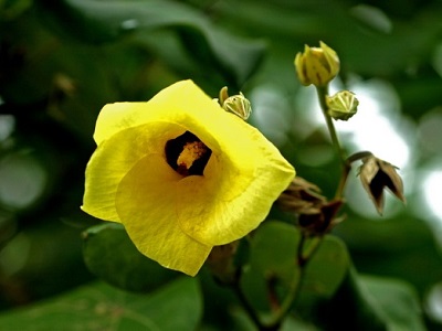An accompanying plant along the seashores, the Hibiscus tiliaceus L. (Cuban bast), a tough, salt tolerant species, is common along the country seashores. The leaves, about the size of the palm, glossy on the up sides, and hairy on the down sides, are heart-shaped. Taiwanese women living in the country often put the leaves right below the “Hung Kuei Cakes.” Thus, the leaves are also called “Cake Leaves” in Taiwan. The flowers are yellow with dark purple color on the bases. Little girls love to paint their fingernails with the dark purple color, using it as fingernail paint.