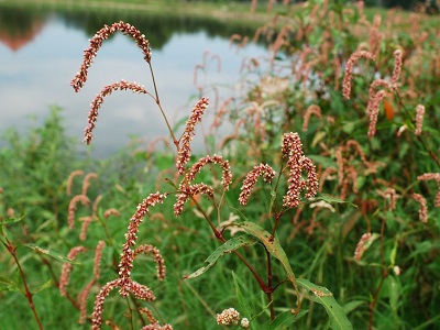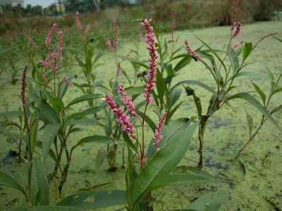 An annual herb, the Polygonum glabrum Willd. (smooth knotweed) likes to inhabit the humid wilderness. It has erect or obliquely upward stems with a tint of red. With many branches and enlarged internodes, the smooth knotweed has needle-shaped leaves with a length from 10 to 20 centimeters. The entire apex is acuminate. Tomenta coat the edges of the upper leaves. Its stems, with narrow wings, are red. The spikes are also red, with 5 small petals.
