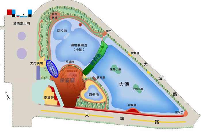 位於大門入口左側,以澄清湖廣場的排水與降雨為主。水生植物生長旺盛,是紅冠水雞、鷦鶯類主要的繁殖水域。浮葉植物以睡蓮為主、四周植被以構樹、台灣欒樹、血桐、巴拉草為主。 |