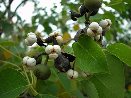 落葉性喬木,葉形略似菱形,尾端漸尖。冬天葉子會變紅,是平地難得的紅葉植物。葉子是褐斑綠刺蛾幼蟲的食草,每到6、7月間是毒蛾幼蟲的大發生期,木棧道上、欄杆扶手都可發現幼蟲爬行其上,膽小的人還真會被嚇到。為雌雄異花同株,有時同一個花序上有雄花和雌花,有時整個花序都是雄花或雌花。果實是球形蒴果,有三個不明顯的稜,成熟時變黑色裂開,露出白色蠟質的假種皮,這層假種皮可製油漆、蠟燭、肥皂,種子可榨油。