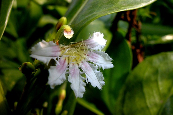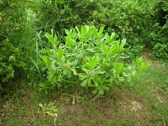 常綠灌木,屬珊瑚礁岩岸植物,莖直立分枝多。葉大片光滑,倒卵形或匙形,肉質全緣。花冠筒狀,二裂,下半邊分裂為5片,外緣有軟毛 ,花瓣外側白色,內側有大片深粉紅色斑,內側基部黃色,藉此吸引昆蟲注意往內鑽,上半部只剩一雌蕊下垂。當蜜蜂等昆蟲鑽入花中採蜜時,因昆蟲本身重量的關係,上方的雌蕊會碰觸到蜜蜂的背部,此時蜜蜂的背部若正好沾有花粉,雌蕊即可藉此沾到花粉而完成授粉的任務。